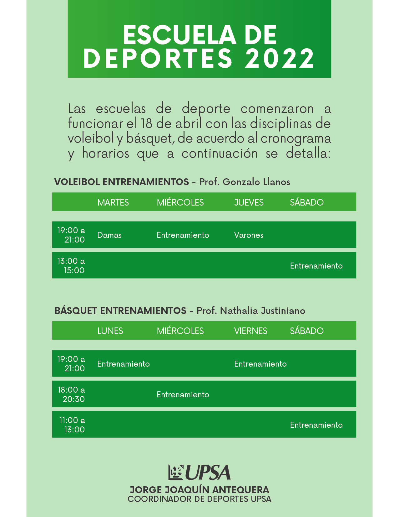 Es por ese motivo que, Joaquín Antequera, nuestro Coordinador de Deportes, ha organizado un espacio para que podás practicar básquet o voleibol, en las Escuelas de Deporte de la UPSA.
